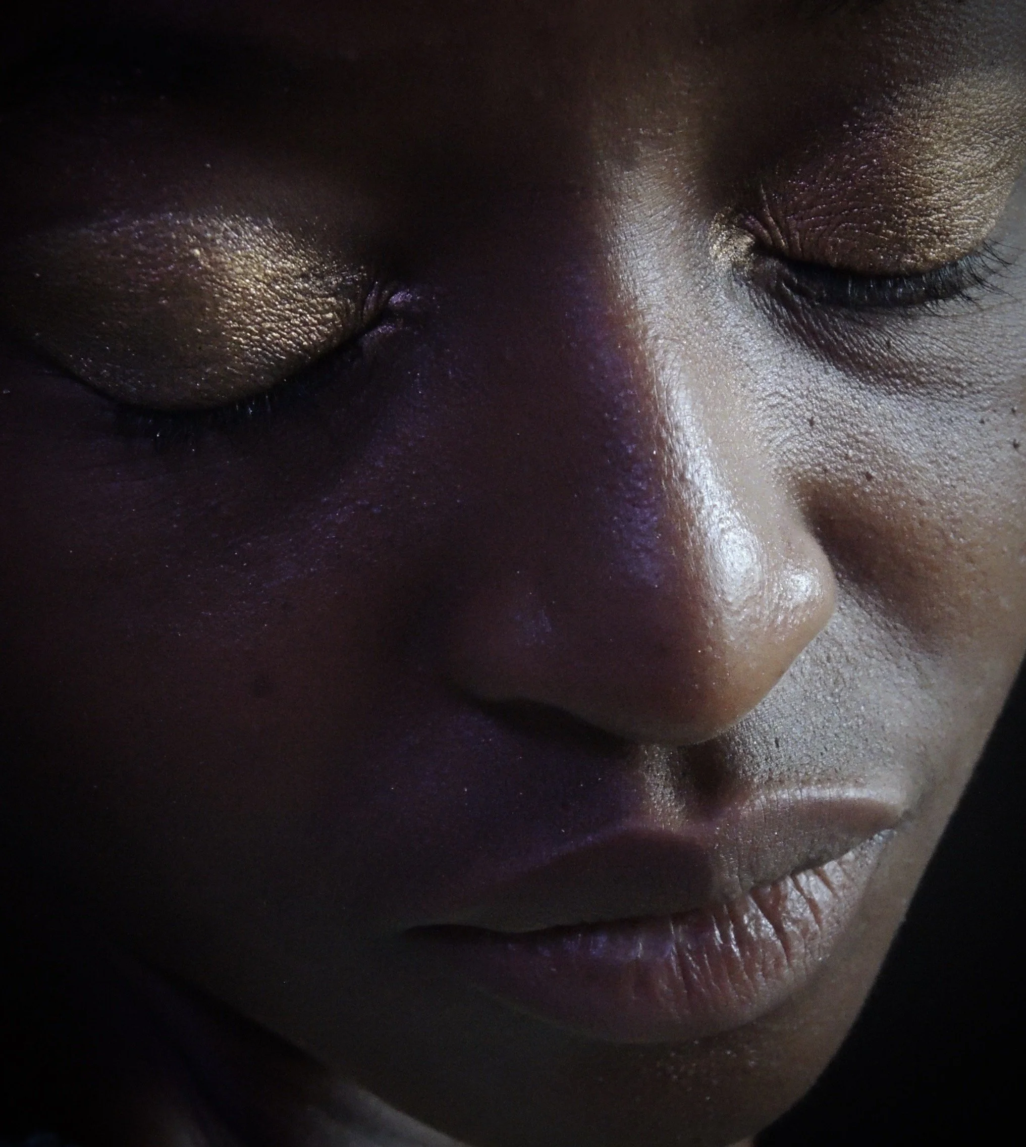 Her eyes are shut, yet she sees. With gold upon her eyelids, she becomes the priestess of an inner realm. Her presence recalls the women who danced barefoot through rituals, who felt music in their blood. Here lies a sensuality that isn’t about being seen, but about being fully felt. Her lips hold kindness, her skin glows with quiet pride. This is a sweetness rooted not in softness, but in resilience. A grace that bends, never breaks.